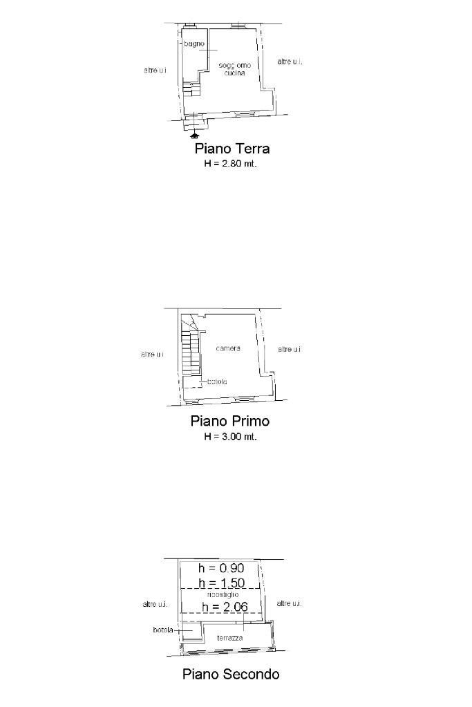 L'appartamento è così suddiviso: al piano terra ingresso su cucina abitabile, e comodo bagno di servizio. Al primo piano vi e' il salotto e un bagno finestrato con box doccia, possibilità di ricavare camera matrimoniale. All'ultimo piano mansardato vi è la camera da letto con affaccio sul balcone. Nel borghetto possibilità di parcheggiare comodamente.